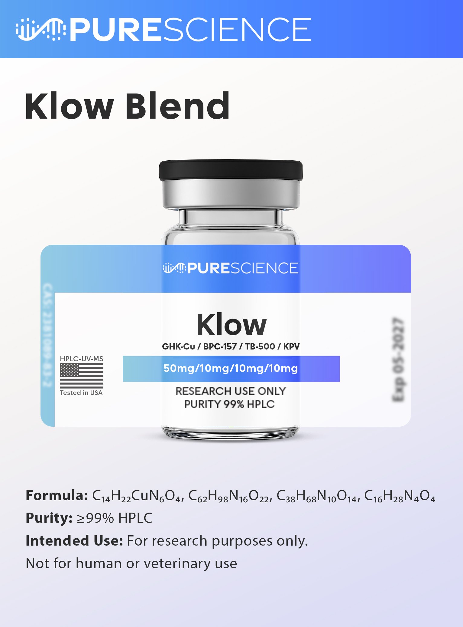 KLOW Blend is FOR RESEARCH USE ONLY and is not intended for human or veterinary use. This product has not been evaluated by the U.S. Food and Drug Administration (FDA) and is not designed for therapeutic, diagnostic, or clinical applications. Any use outside of legitimate in vitro research may violate applicable laws. By purchasing this product, the buyer represents and warrants that it will be used exclusively for lawful research purposes.